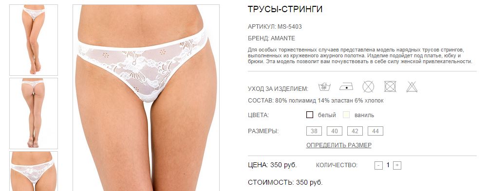 Трусы - стринги из кружевного полотна с хлопковой ластовицей. По центру передней детали украшение - бантик.