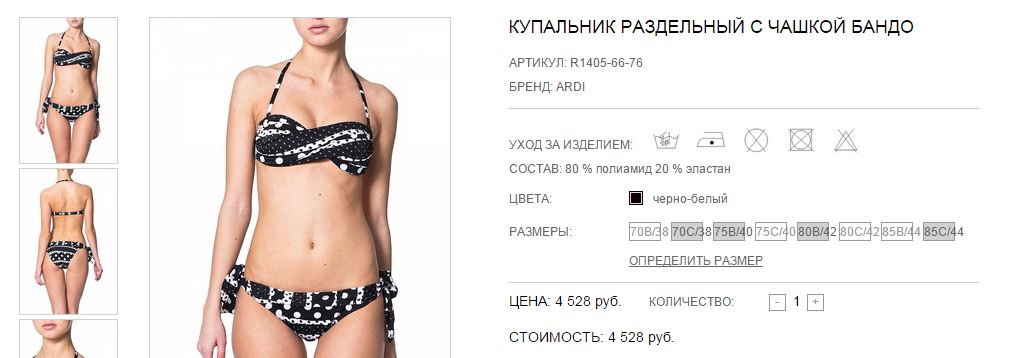Купальный бюстгальтер формы бандо с формованной чашкой без каркасов. Чашки с легкой драпировкой по центру и по бокам. Трусы купальные с драпировкой и завязками по бокам.