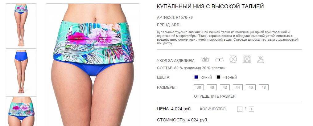 Купальные трусы с завышенной линией талии. Спереди широкая вставка с драпировкой по центру.