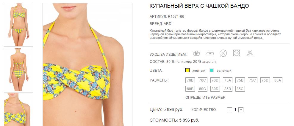 Купальный бюстгальтер бандо с формованной чашкой без каркасов. Чашки с перекручивающейся драпировкой по центру. Сзади широкая завязка. Съемная узкая шейная бретель.