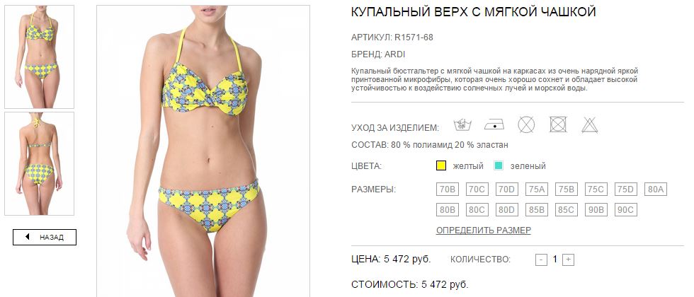 Купальный бюстгальтер с мягкой чашкой на каркасах. Чашки с перекручивающейся по центру и по бокам драпировкой. Сзади металлическая застежка. Узкие несъемные бретели завязываются на шее.