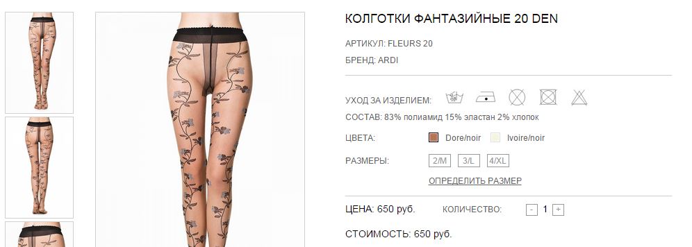 Тонкие фантазийные колготки с выбитым рисунком в виде цветов по всей ноге. Однородные по всей длине, с плоскими швами и хлопчатобумажной ластовицей, с усиленным мыском
