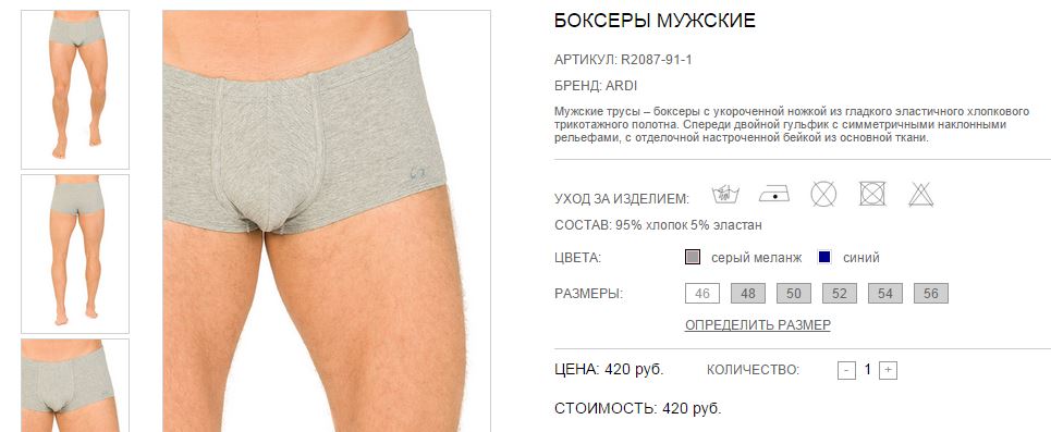 Мужские трусы - шорты из хлопка. Спереди рельефы гульфика подчеркнуты настроченной бейкой. Сбоку спереди на ноге аппликация в виде фирменной кошки ARDI, выполненной в технике "флок".