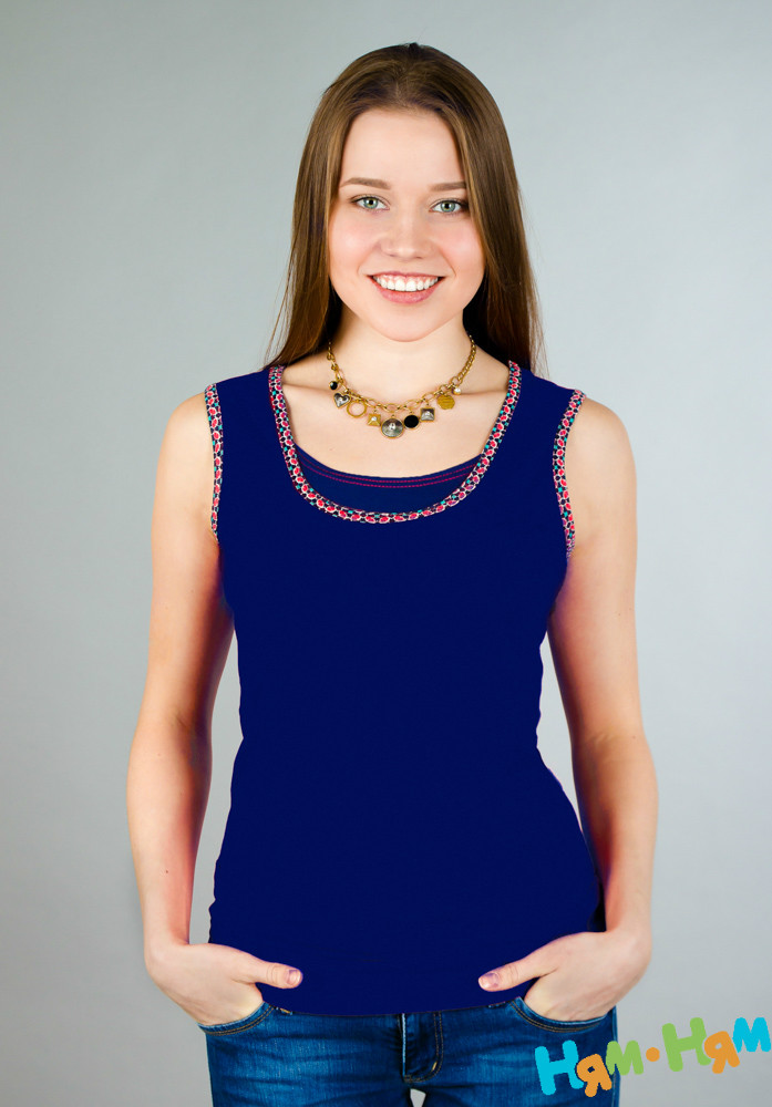 Майка сочного синего цвета с разноцветной окантовкой и секретом для кормления малыша - удачное дополнение к гардеробу молодой мамы
