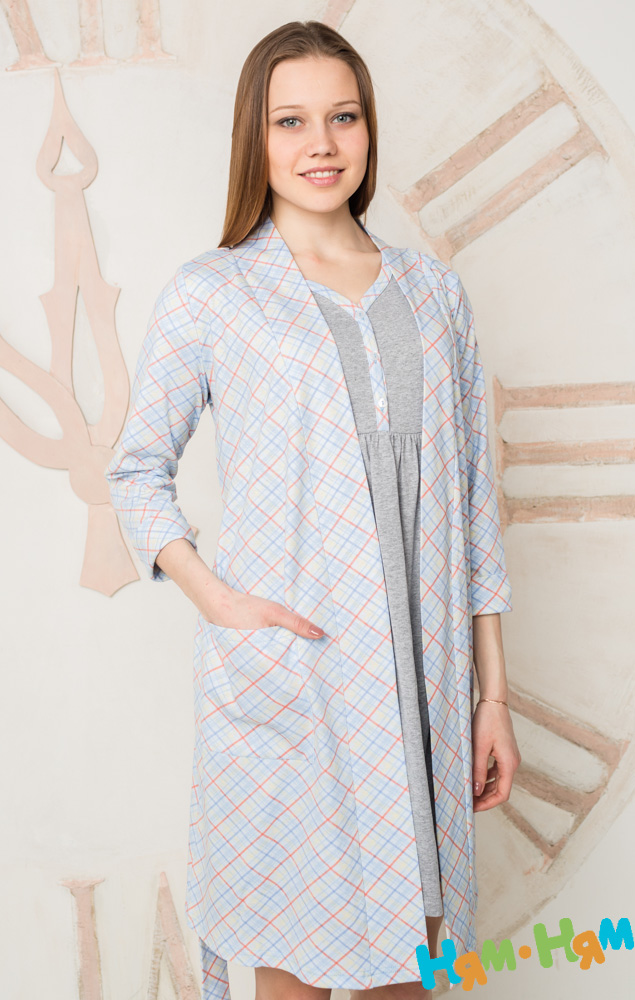 Халат с принтом из голубой клетки свободного кроя, на запах, с поясом, рукавом 3/4 с отворотом, карман на правой детали переда.