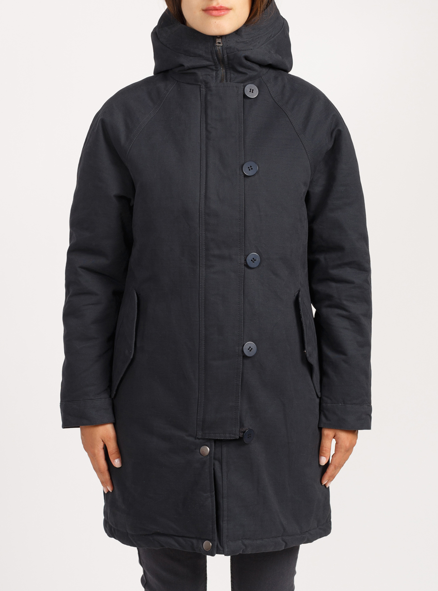 Женская утепленная куртка, рассчитанная на позднюю осень-зиму. Выполнена из хлопковой ткани с водооталкивающей пропиткой. Эффектная подкладка из смесовой ткани с добавлением шерсти. Длина изделия до середины бедра.