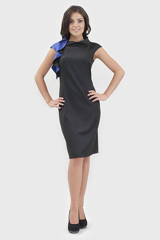 Описание: платье-футляр из стрейчевой ткани. С помощью рельефов достигается прилегание к фигуре. Декоративным элементом является драпированный волан из атласной ткани контрастного цвета, выполненный на одном плече.