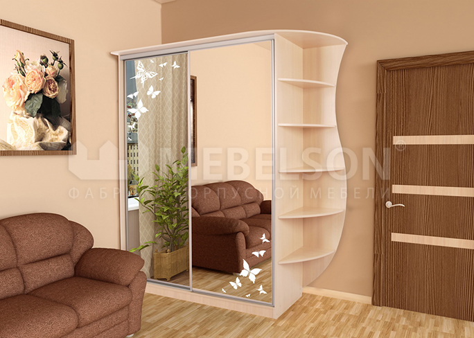 Фасады дверей выполнены из зеркал с матированным рисунком <<Бабочка>>. Рисунок износостойкий, следы на нем не остаются. Зеркала безопасны, выполнены по технологии триплекс."