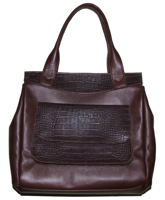 Коричневая кожаная сумка с карманом на лицевой стороне, клапан сделана под кожу крокодила