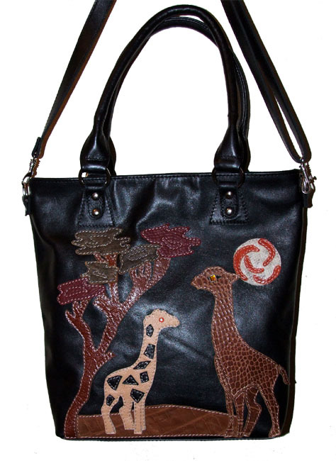 Черная кожаная сумка, с нашитой картиной "Жирафы"