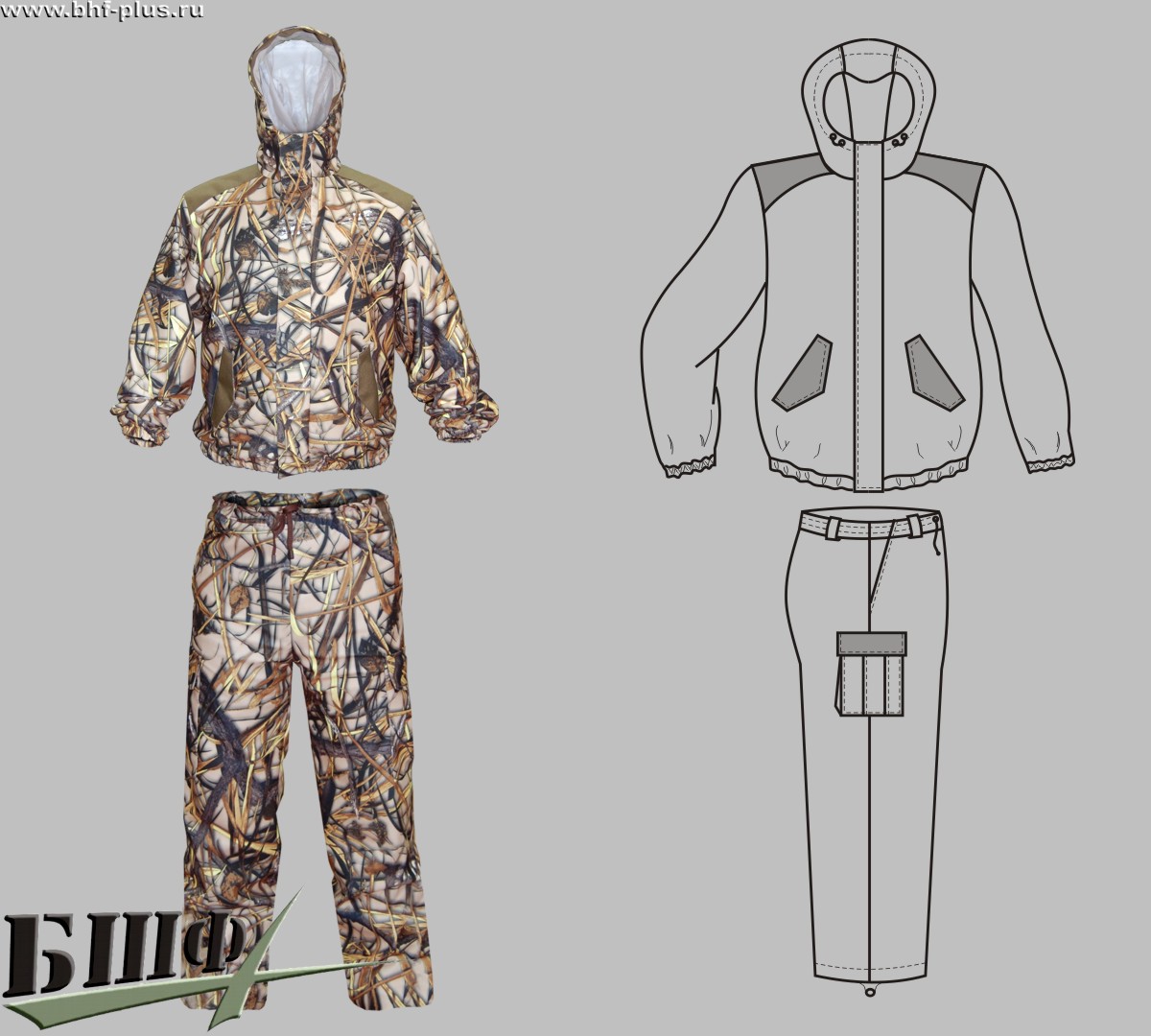 Легкий демисезонный костюм из дышащей ткани, на подкладке из сетки. Куртка с капюшоном, укороченная на молнии, два боковых кармана с клапанами + внутренний. Ветрозащитный клапан на молнии. Брюки пояс на резинке, два боковых кармана.