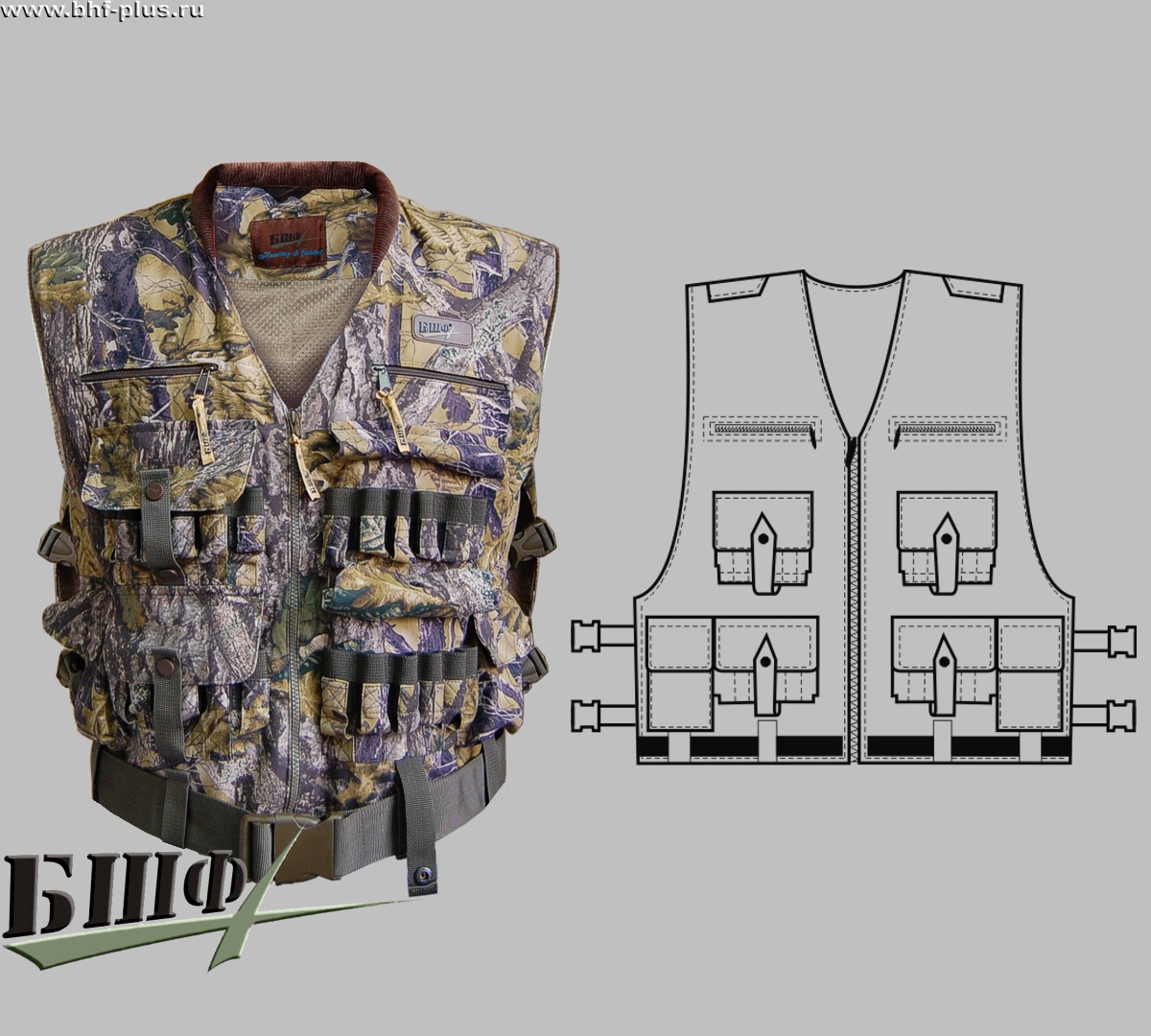 Жилет для охоты с 4 патронташами из специальной ленты. Размер регулируется стропными лентами на фастеках. 11 многофункциональных карманов. Сзади находится удобный карман-рюкзак под трофеи.