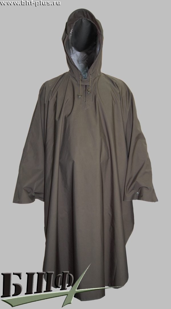 Плащ накидка из прочной, прорезиненной ткани, с проклеенными швами. Капюшон с козырьком.