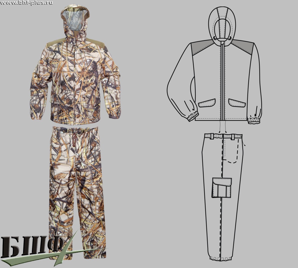 Костюм ВВЗ. Длинная ветровка на молнии с капюшоном. По низу два кармана с клапаном. На брюках четыре кармана. Пояс на резинке со шнуром.
