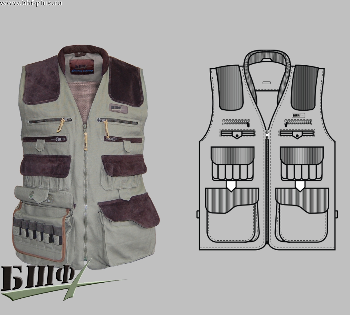 Охотничий жилет удлиненной модели на молнии, Съемные патронташи внутри карманов. Нагрудные патронташи с клапанами. Плечевые вставки из замши предотвратят спадание ремня.